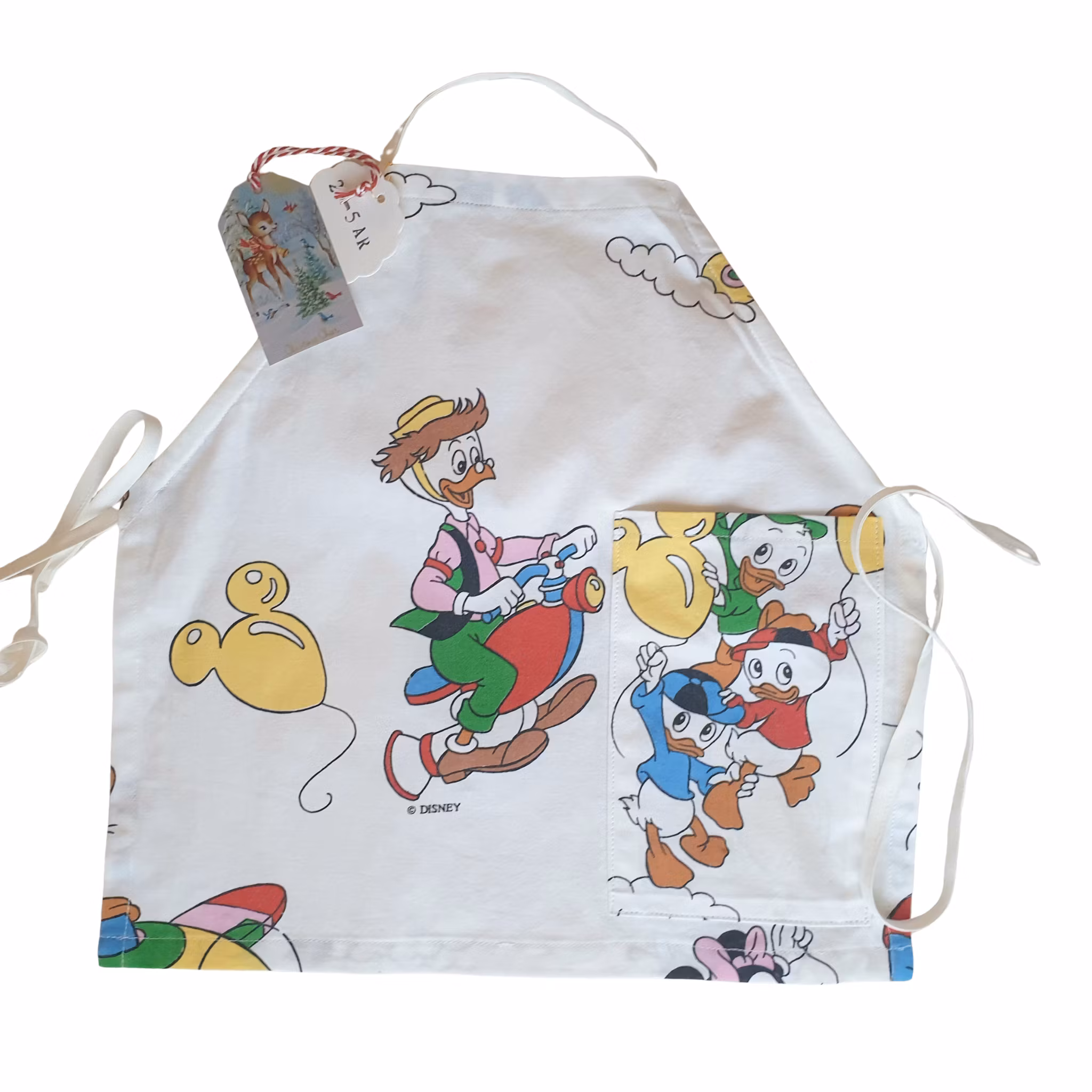 Storlek: 2-5 år. Längd 39cm, bredd 38cm. Justerbara band som knyts i ryggen.