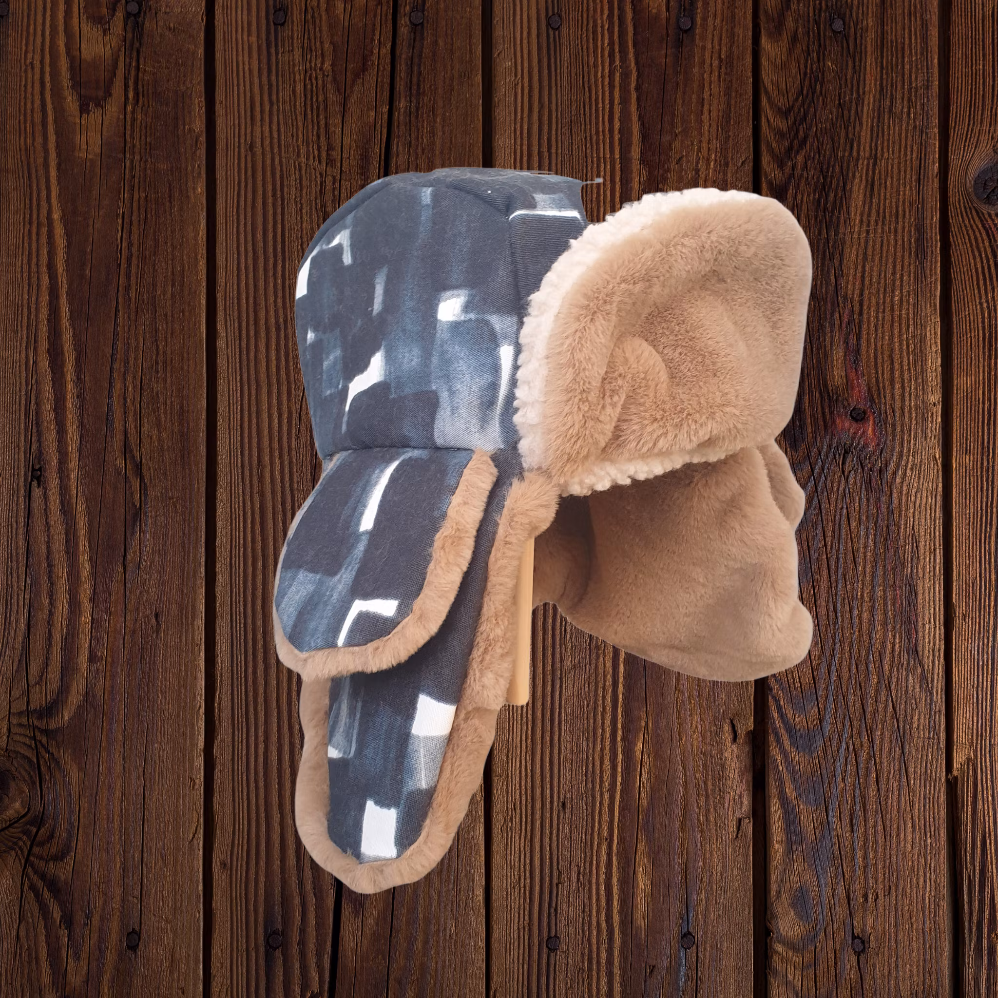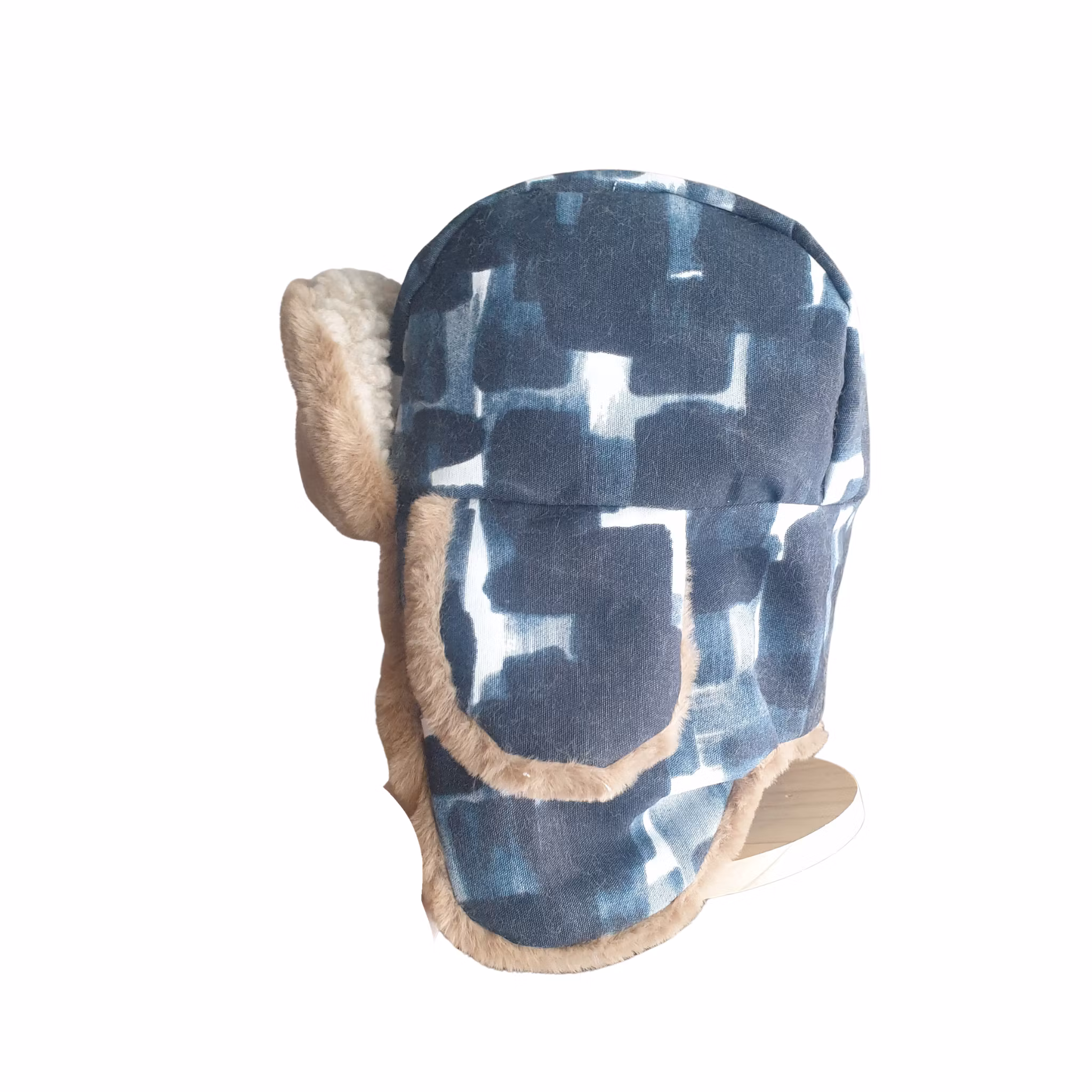 Material: Mössa med öronlappar i Kirunastil! Fodrad med mjuk fuskpäls och yttertyg i canvas i blåa toner.
