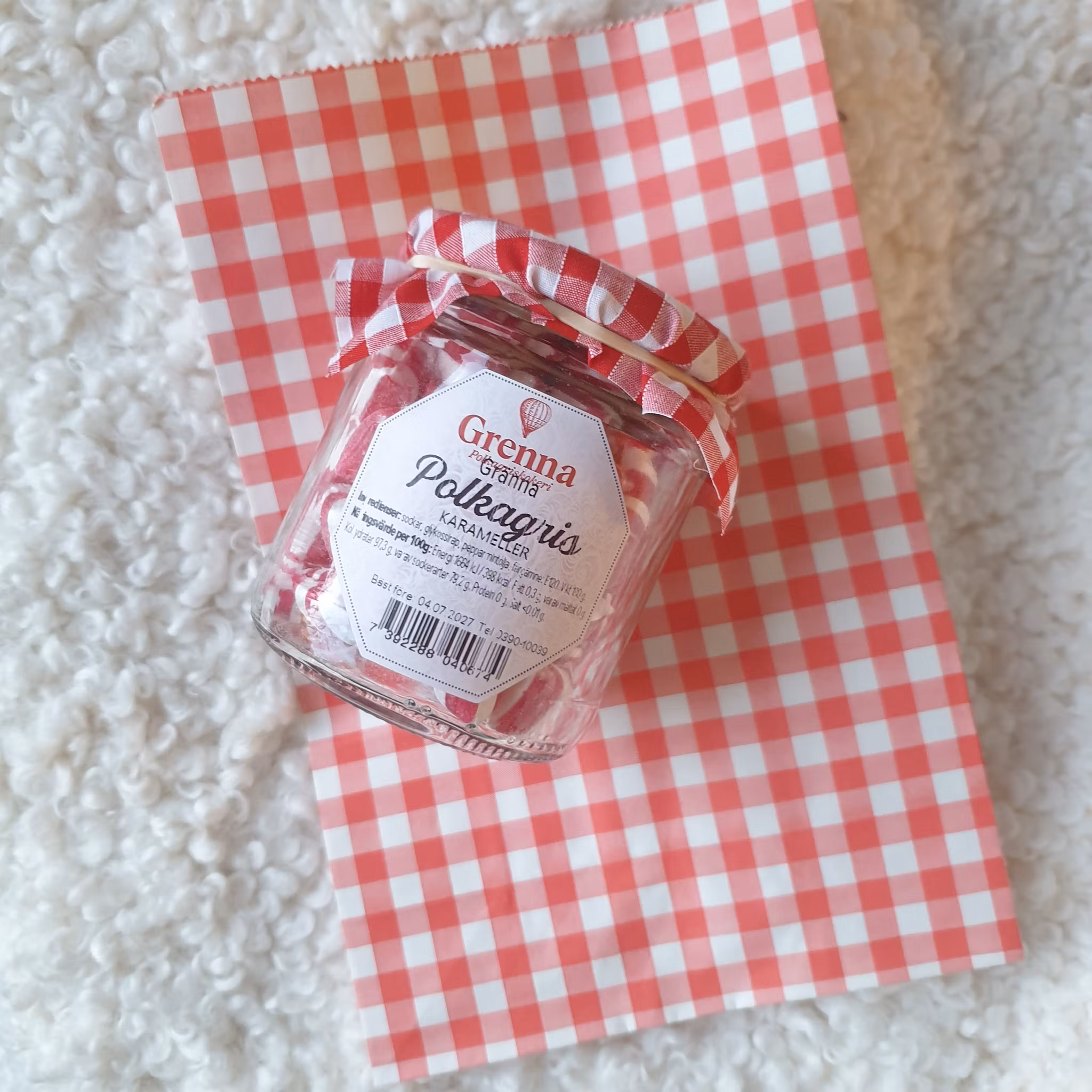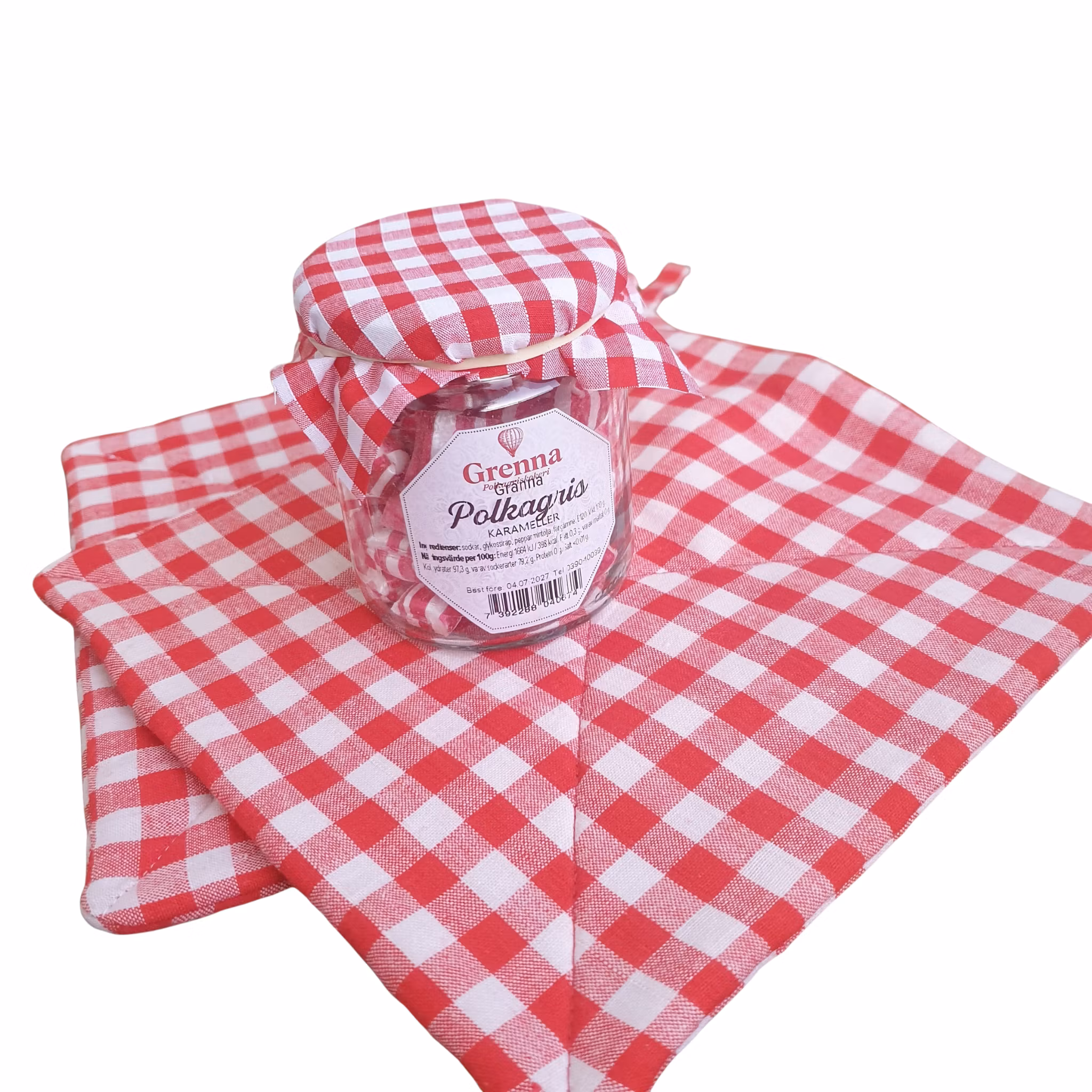 Förpackning: Fin gammeldags glasburk med tyghätta i röd och vit rutigt tyg.