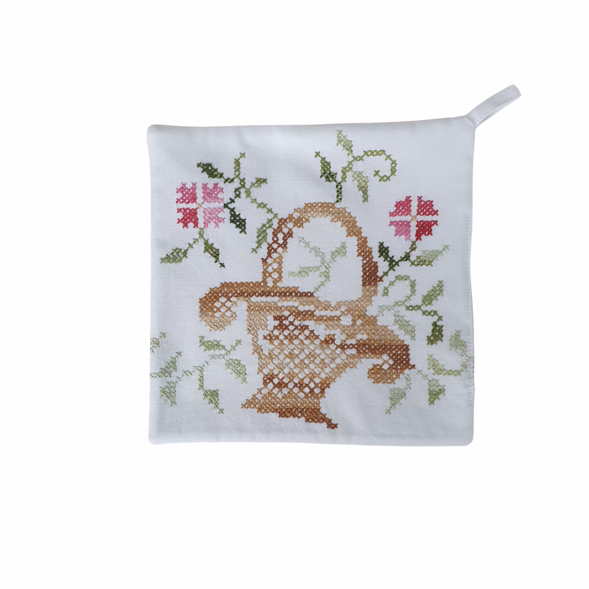 Material: En kvadratisk grytlapp med handbroderade blomkorg i rosa, brunt och grönt. Fodrad med värmevadd.