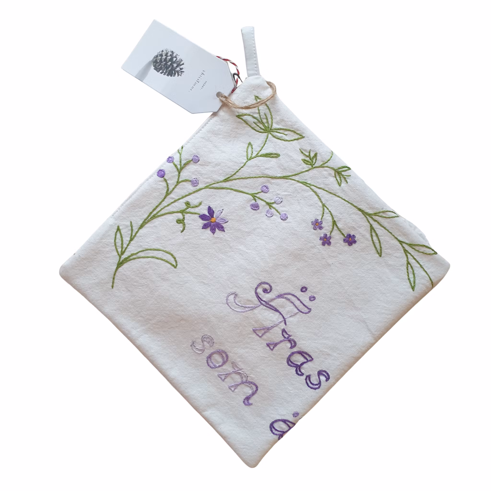 Material: En kvadratisk grytlapp gjord av en handbroderad duk.