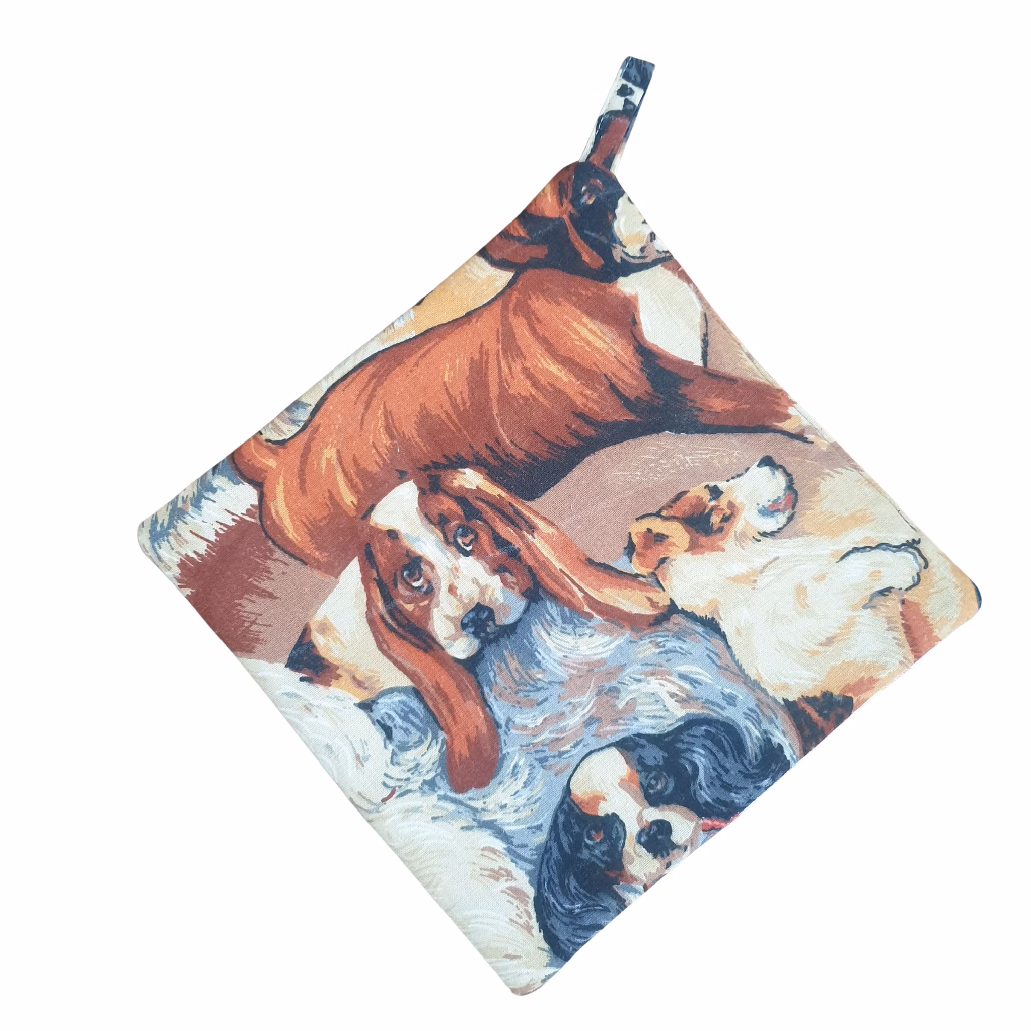 Material: En kvadratisk grytlapp med hundmotiv. Baksidan har rutigt tyg i brunt och vitt. Fodrad med värmevadd.
