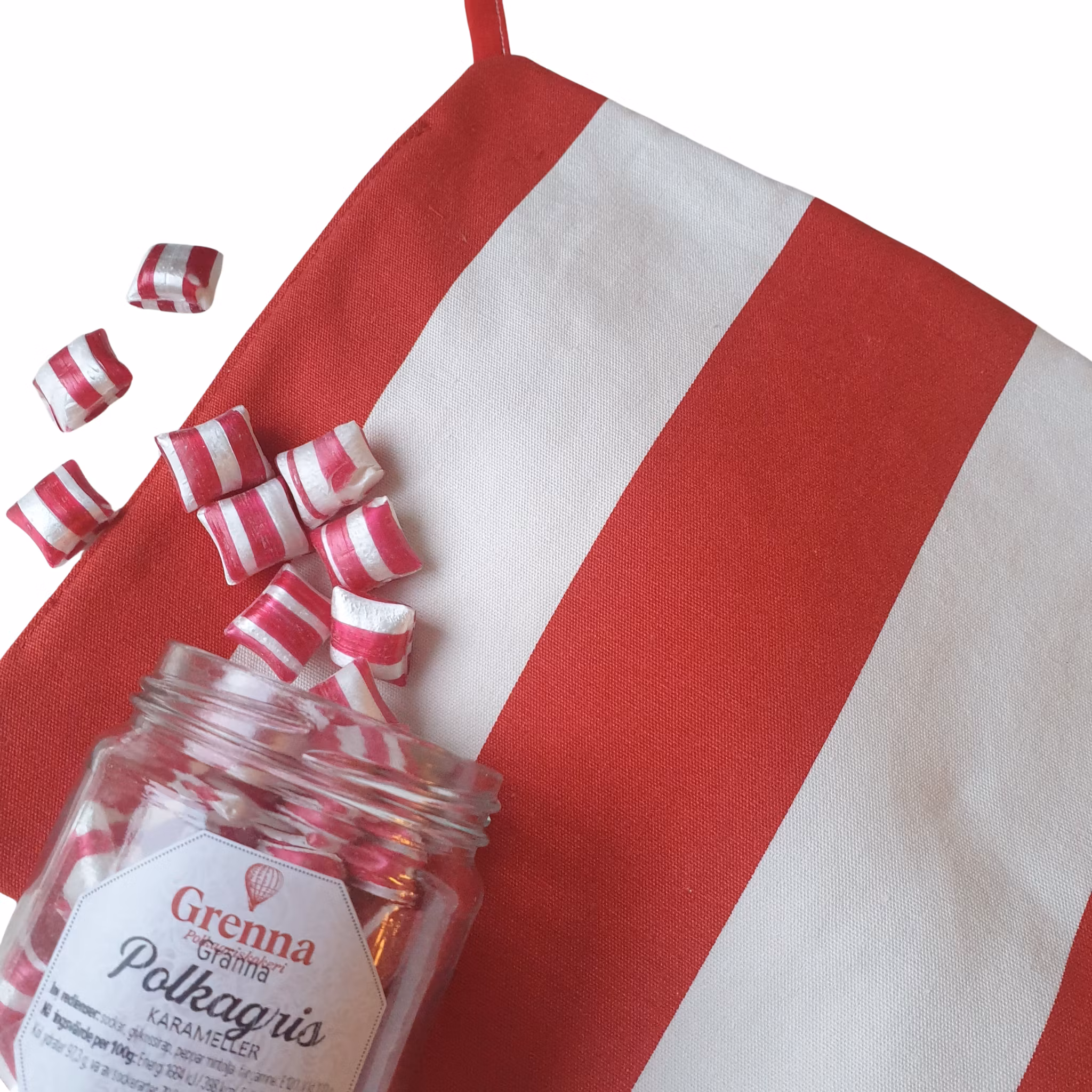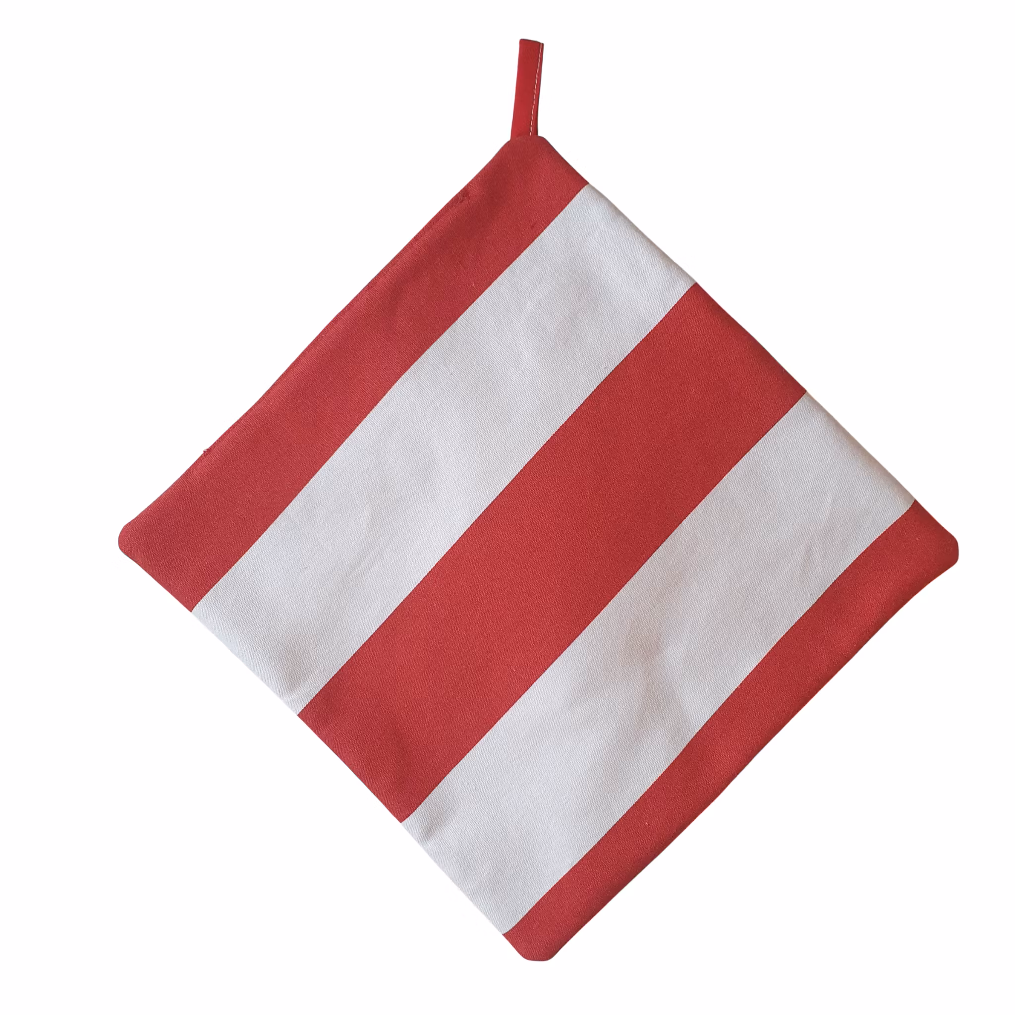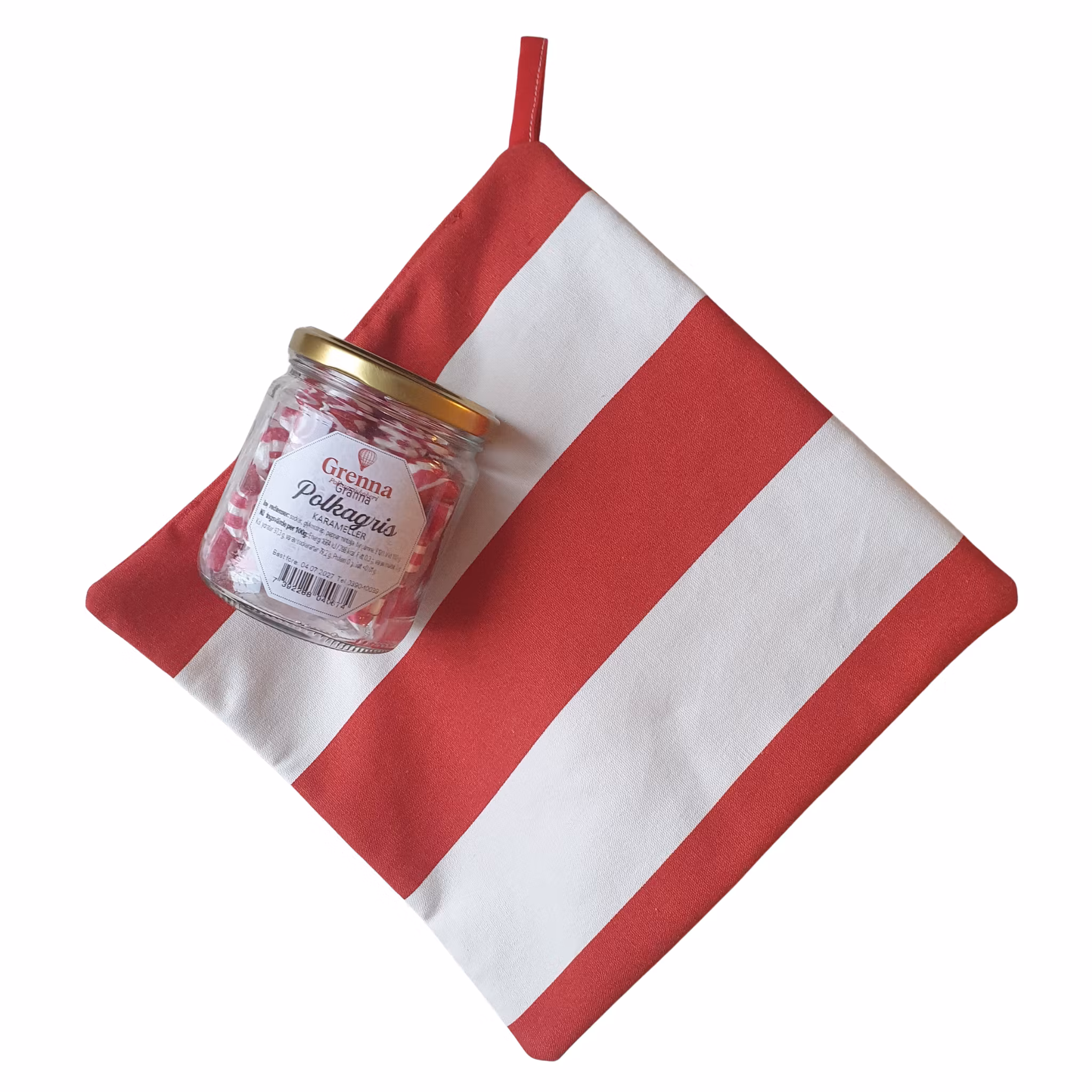 Material: En kvadratisk grytlapp av kraftigt canvastyg med polkagrisränder i rött och vitt.