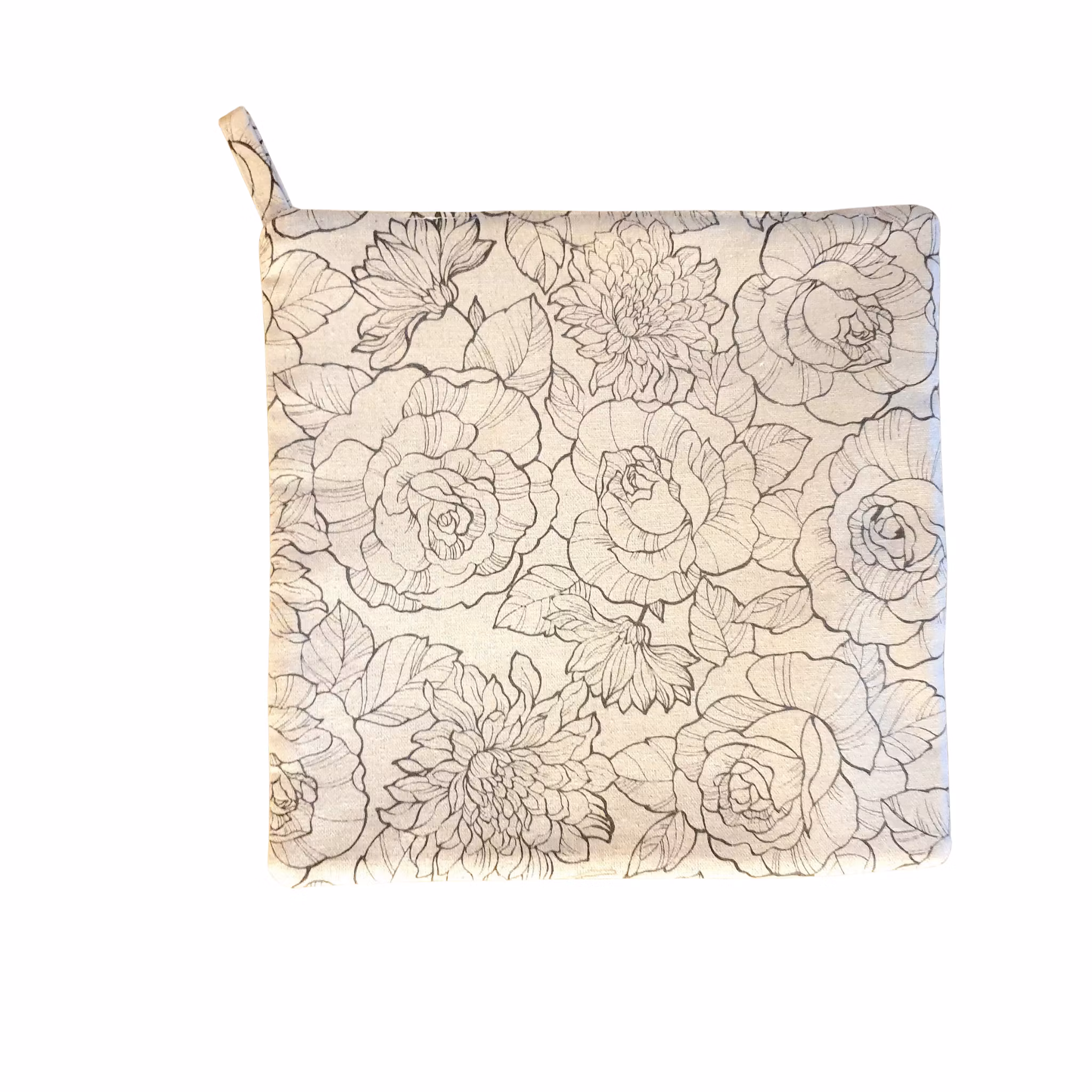 Material: En kvadratisk grytlapp med vackra rosor i naturtoner, beigt och brunt. Fodrad med värmevadd.