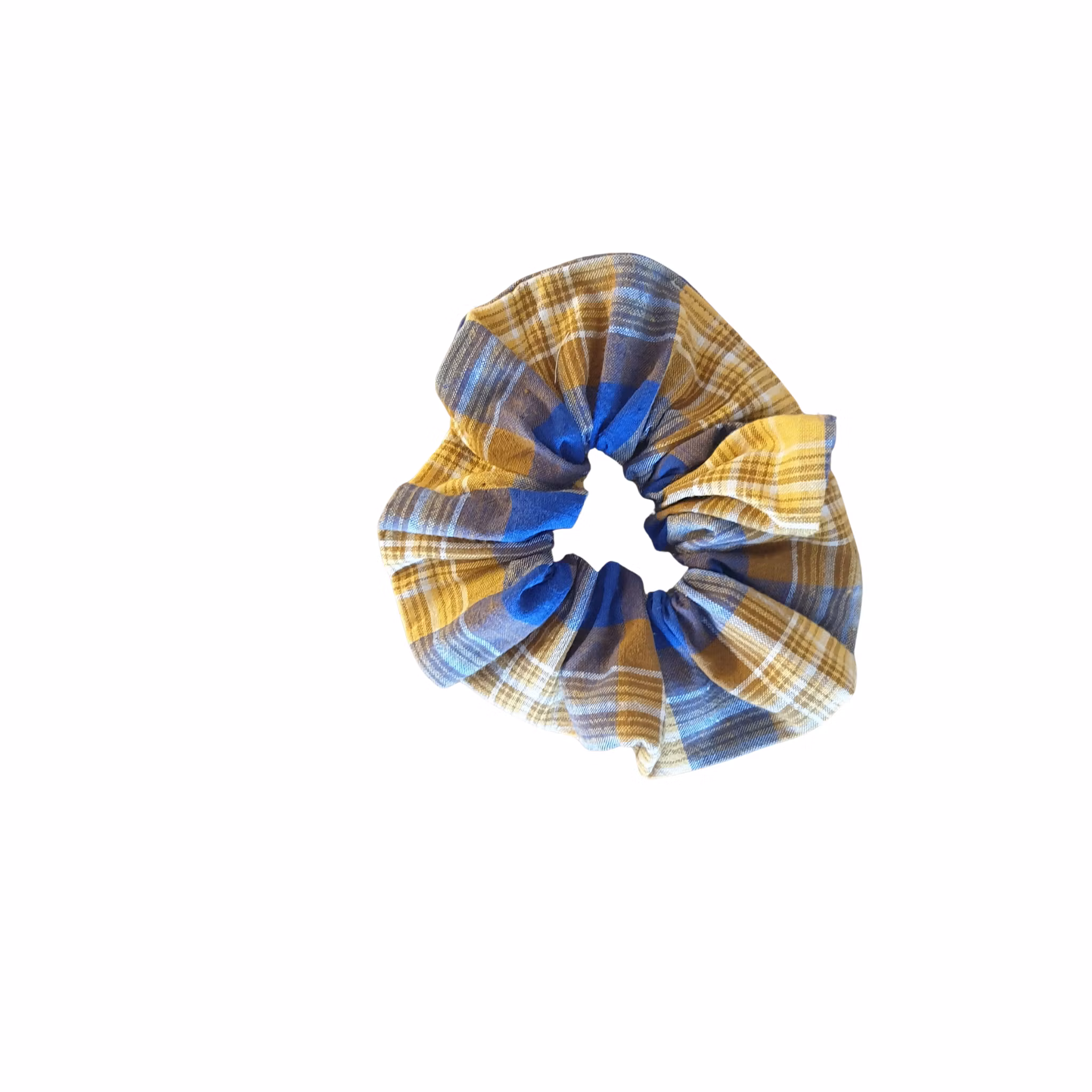 Material: Återvunnet tyg av en gardin i gult, vitt,brunt och blått.