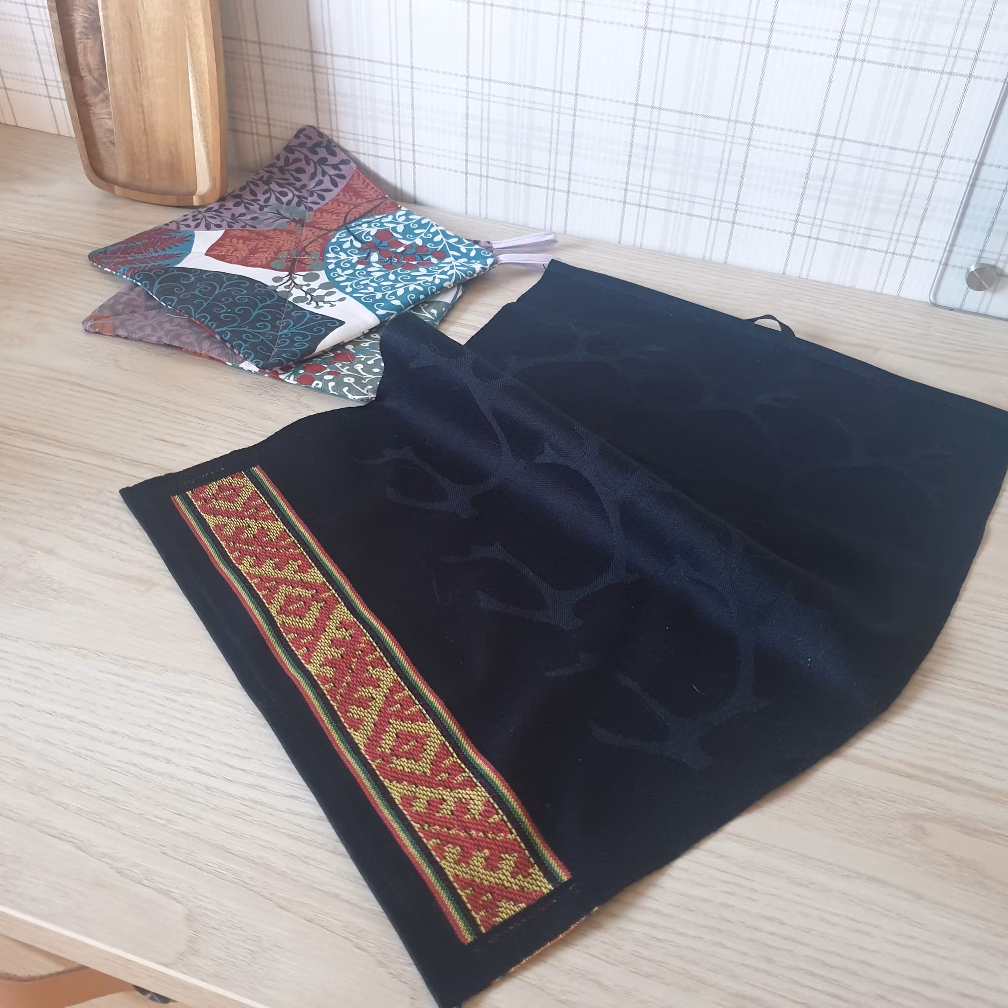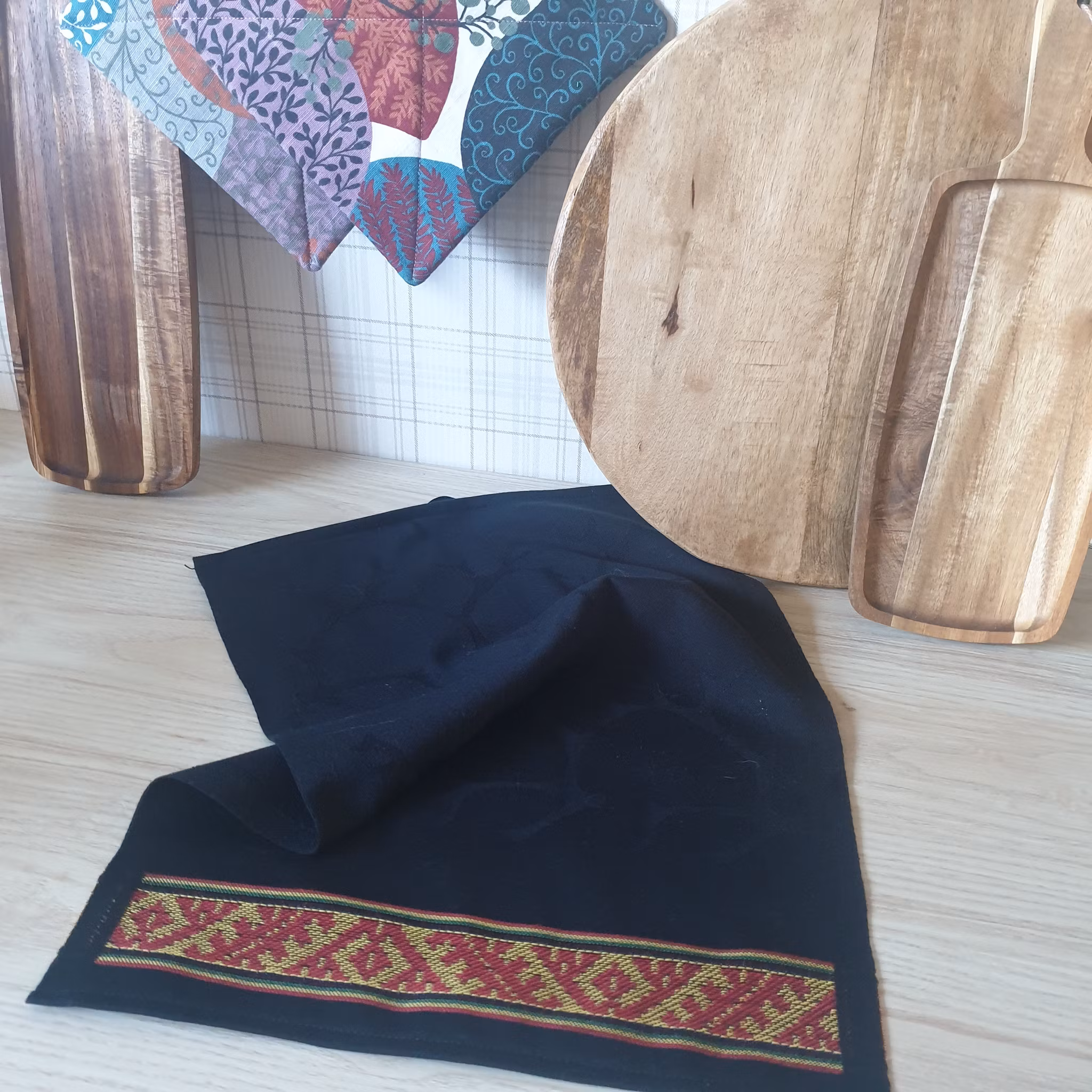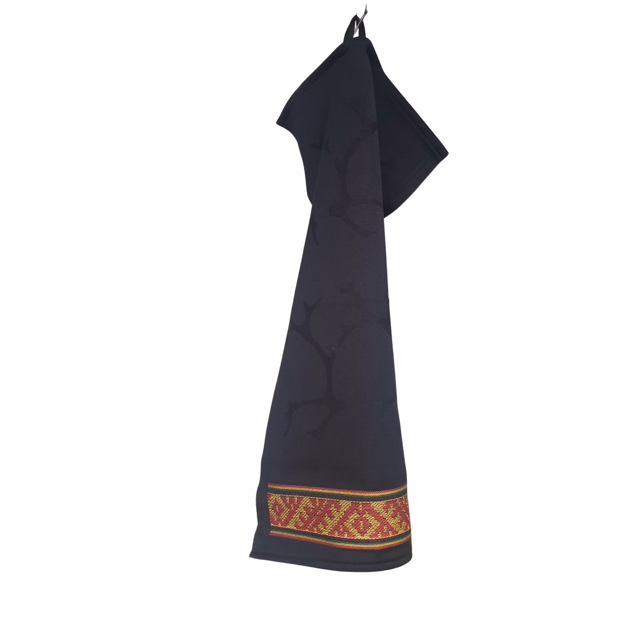 Material: 100% Ekologisk bomull, svart färg med vävda renhorn och kant i gult, rött och grönt.