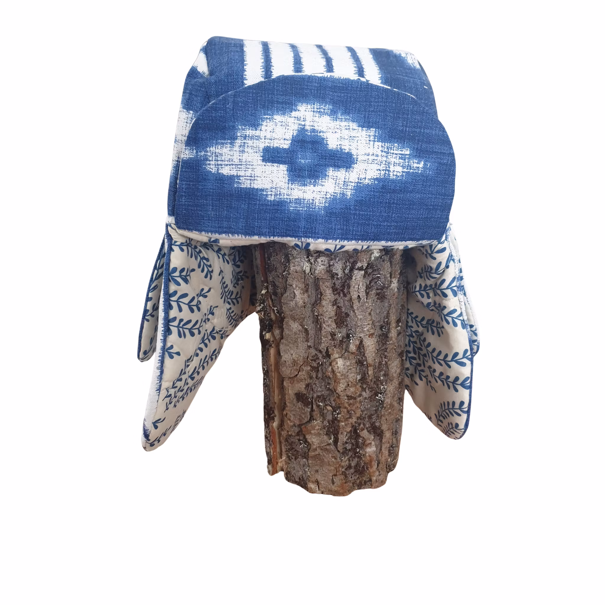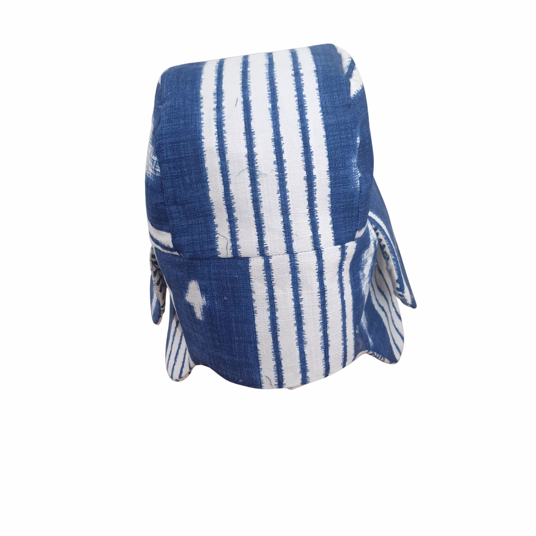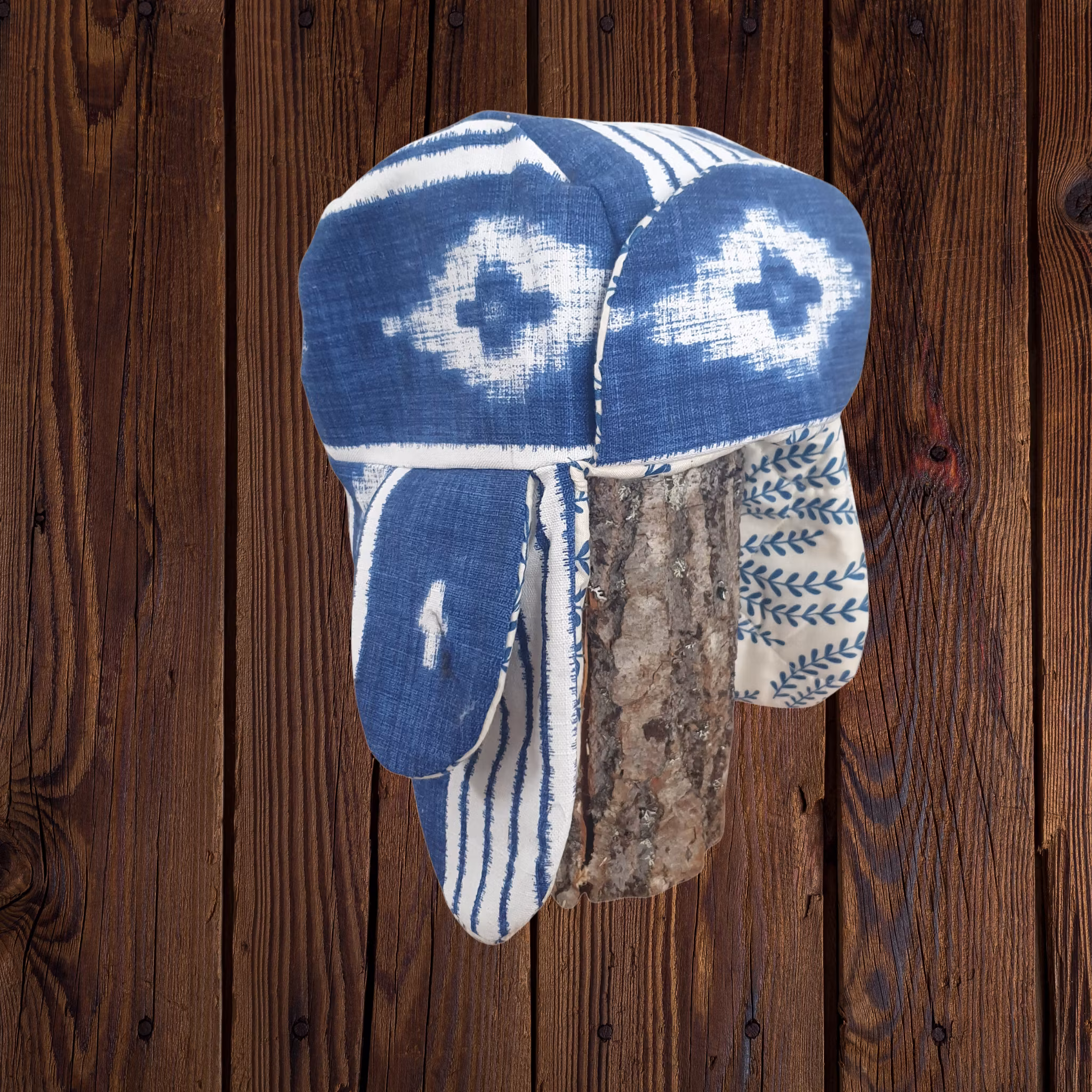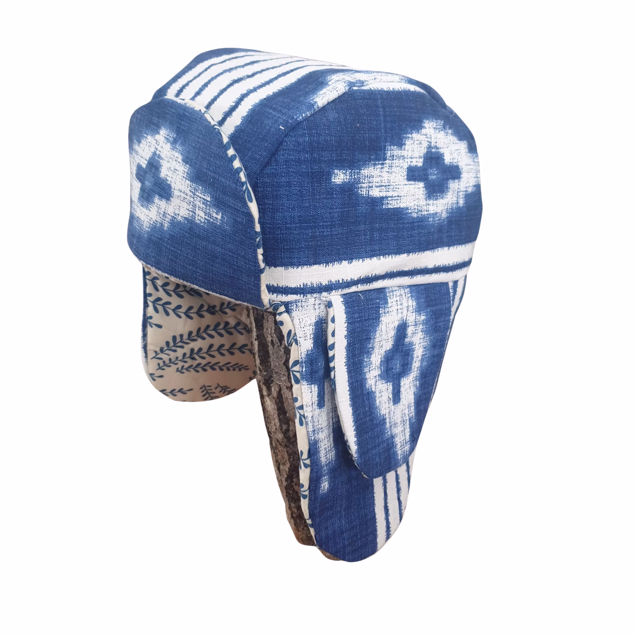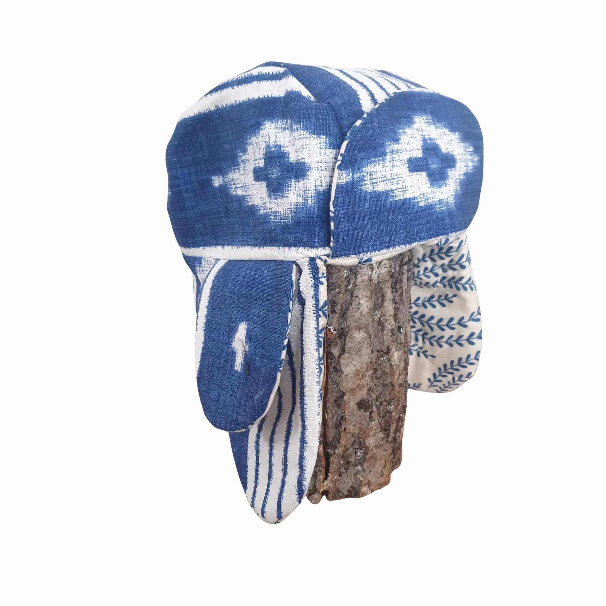 Material: Mössa med öronlappar i Kirunastil! Fodrad med ett quiltat överkast och yttertyg av lite kraftigare tyg i kornblått och vitt.