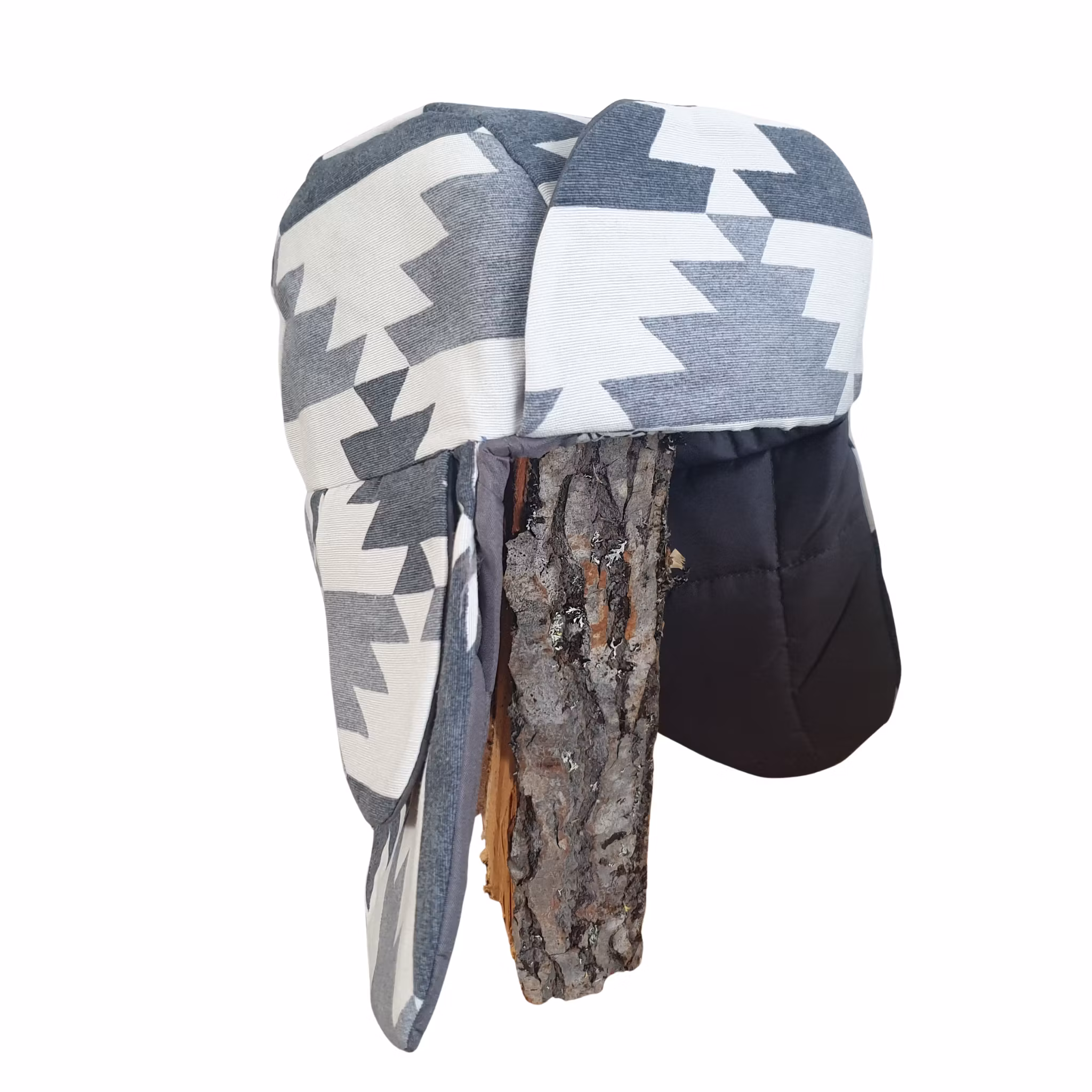 Material: Mössa med öronlappar i Kirunastil! Fodrad med ett quiltat överkast och yttertyg av grå och vitmönstrade inkamönster.