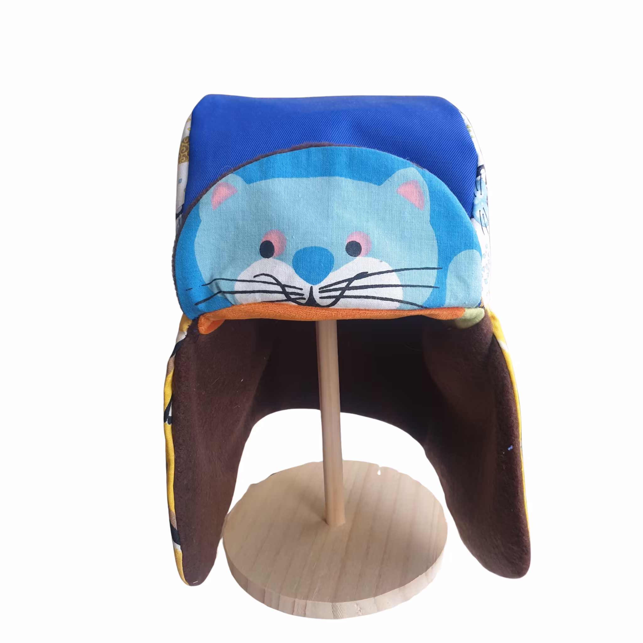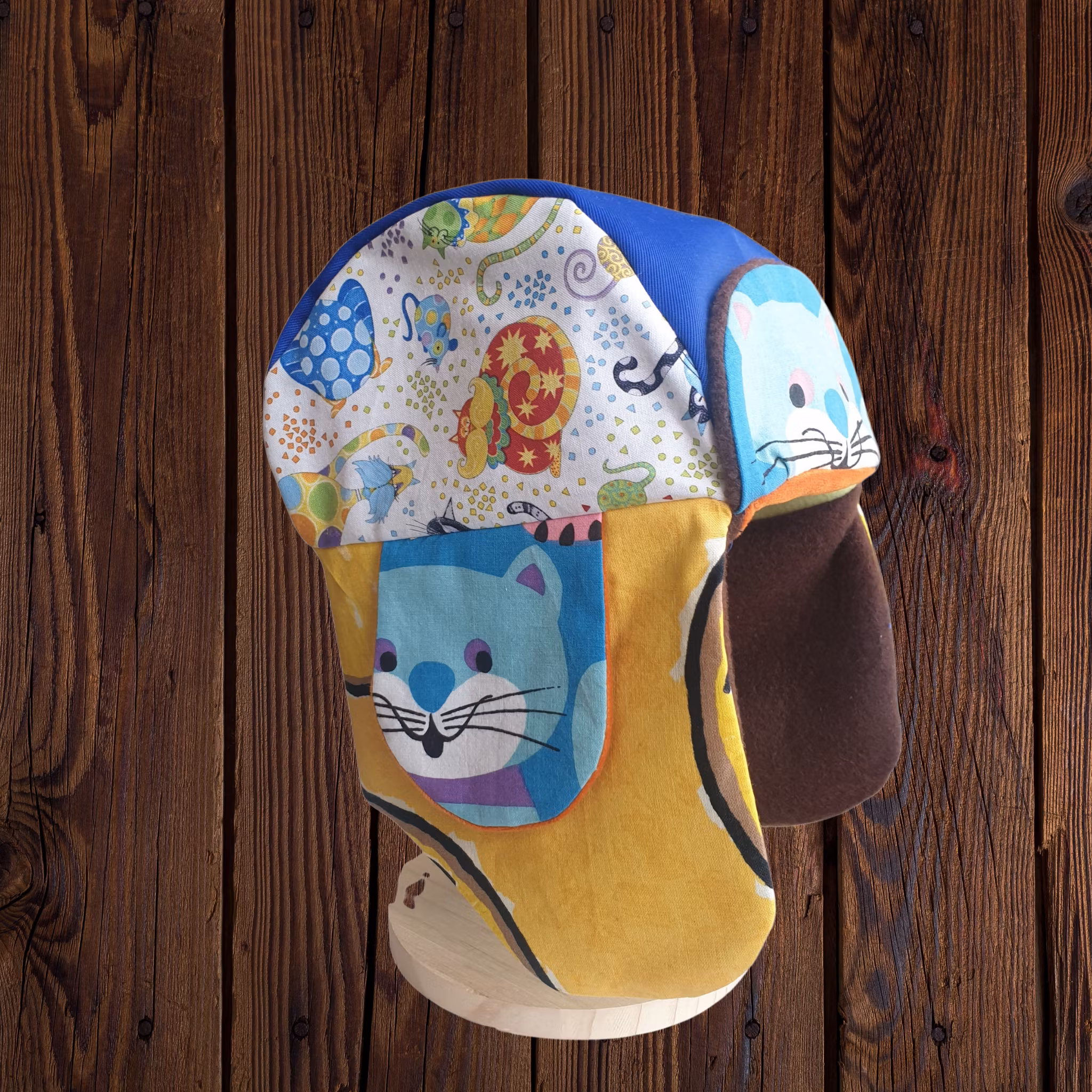 Material: Mössa med öronlappar i Kirunastil! Fodrad med mjuk fleece och yttertyg i blå bävernylon och glada katter.