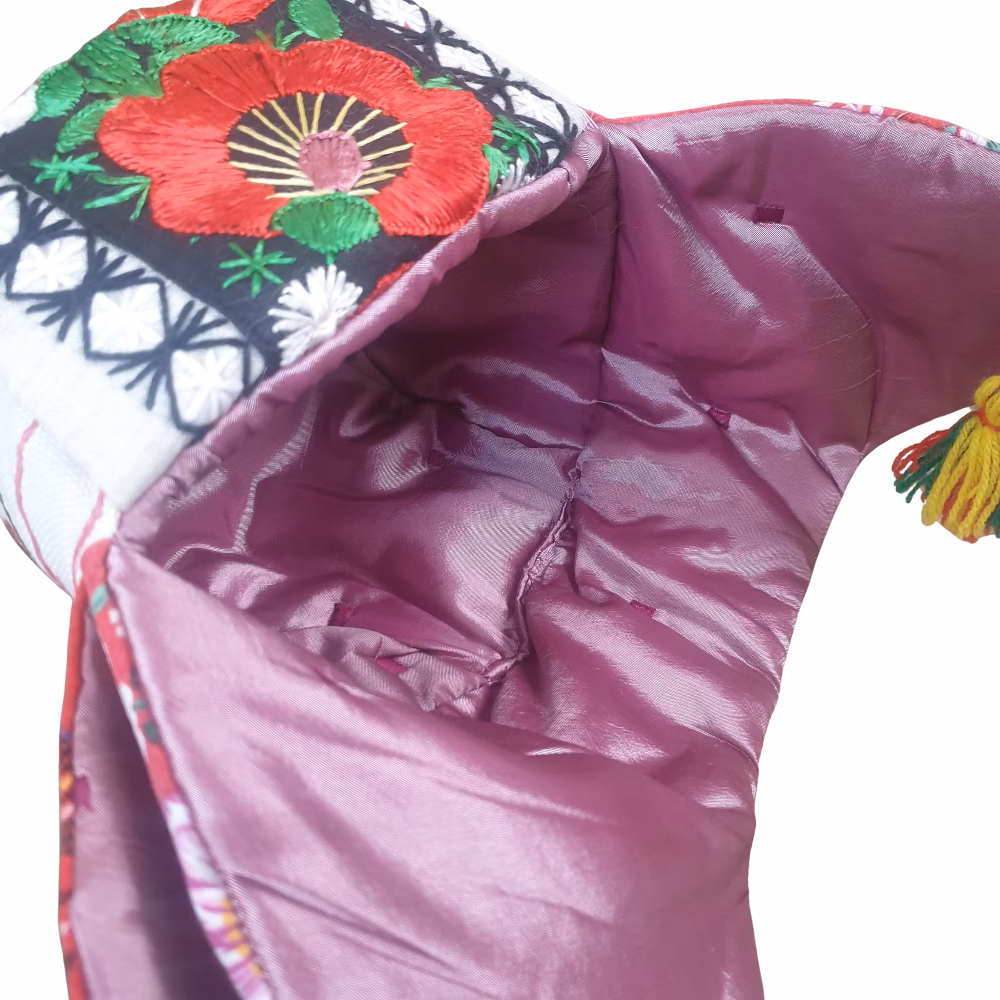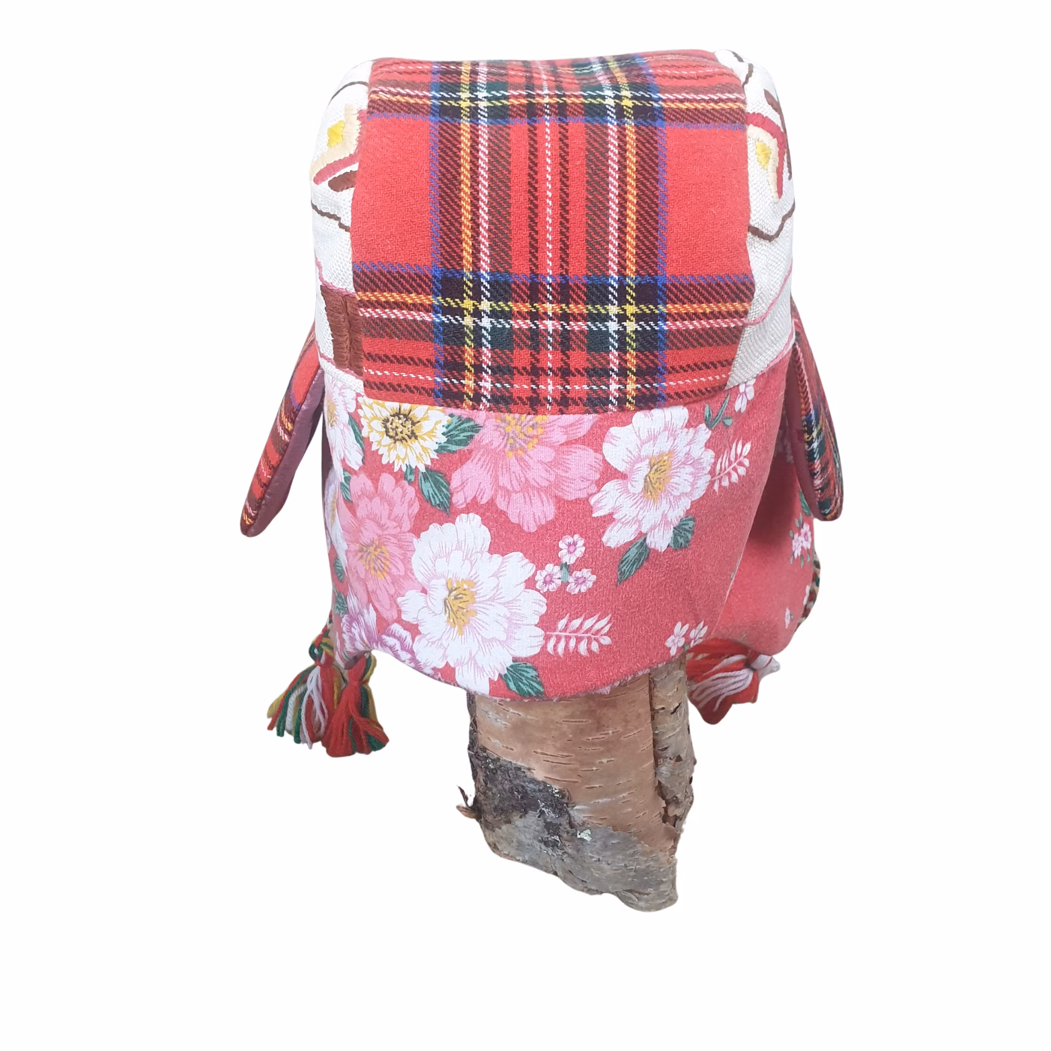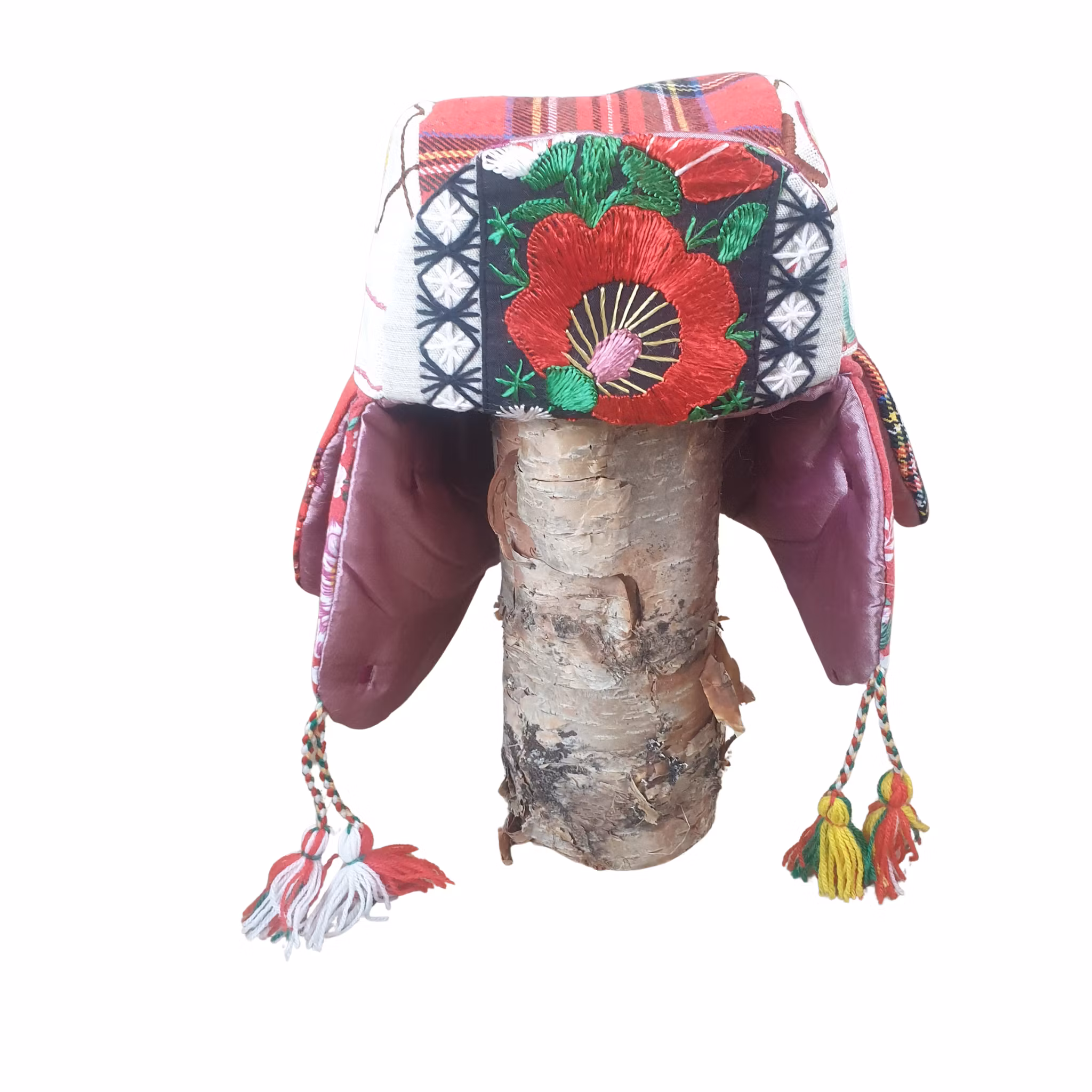 Material: Mössa med öronlappar i Kirunastil! Fodrad med och blankt rosa överkast och yttertyg fint kvalitetsulltyg i rutmönster i kombination med handbroderade bonader samt blommigt tyg baktill. Handgjorda toffsar på sidorna i vitt, grönt, gult och rött.