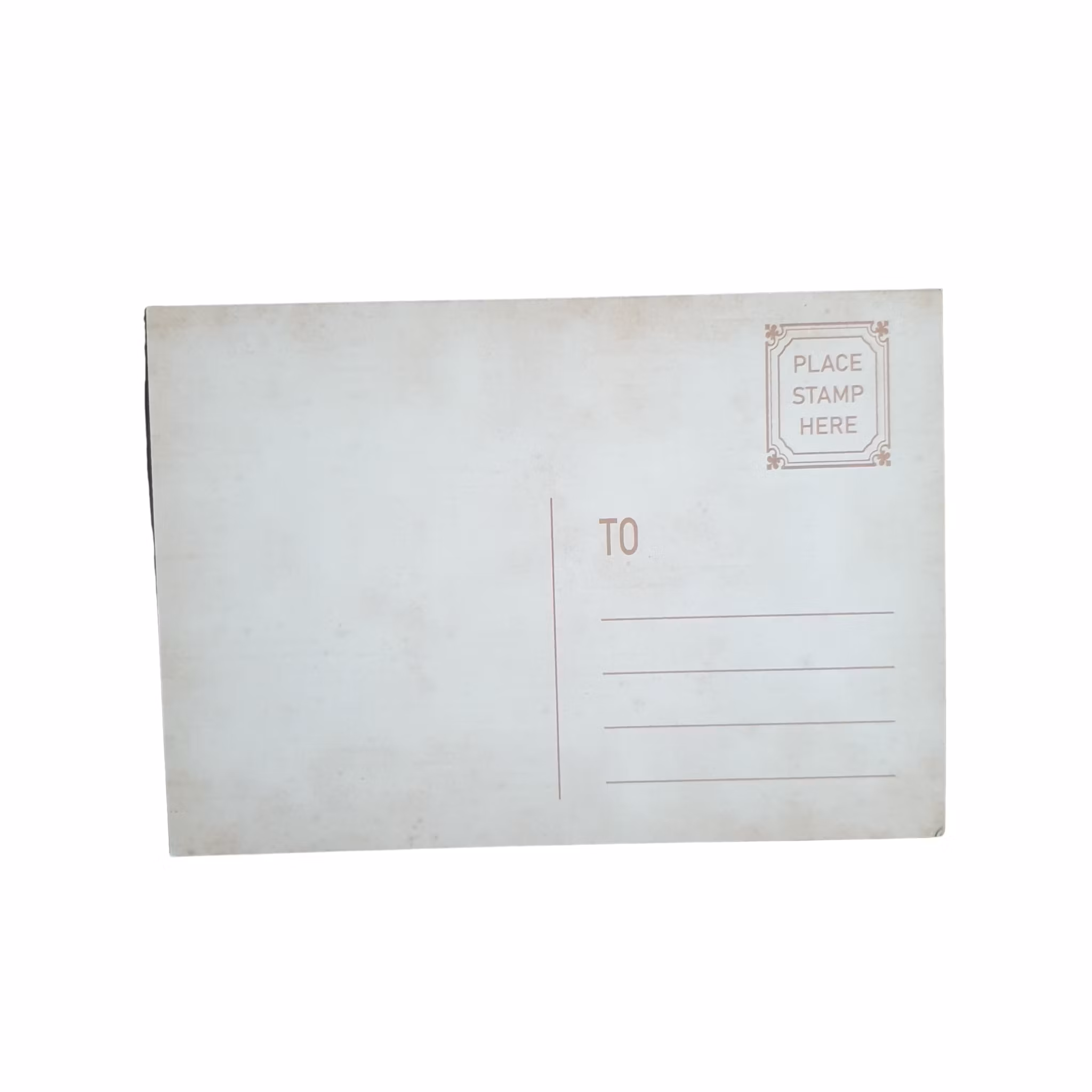 Material: Vykort i lite glansigt papper med ljusbeige baksida, se sista fotot.