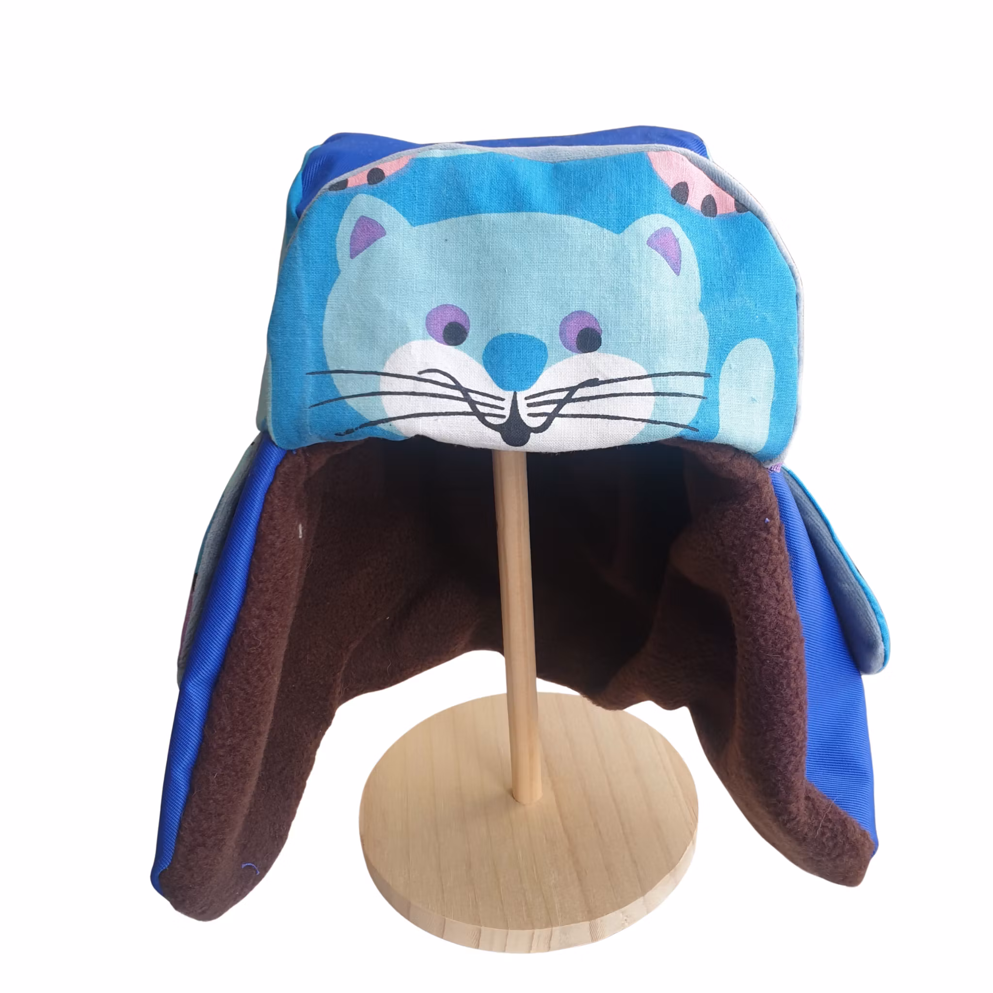 Material: Mössa med öronlappar i Kirunastil! Fodrad med mjuk fleece och yttertyg i blå bävernylon och glada katter.