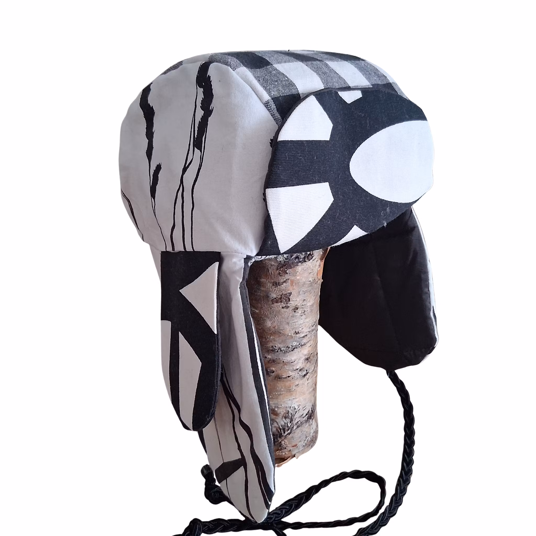 Material: Mössa med öronlappar i Kirunastil! Fodrad med ett quiltat svart överkast och yttertyg i olika svartvita mönster.