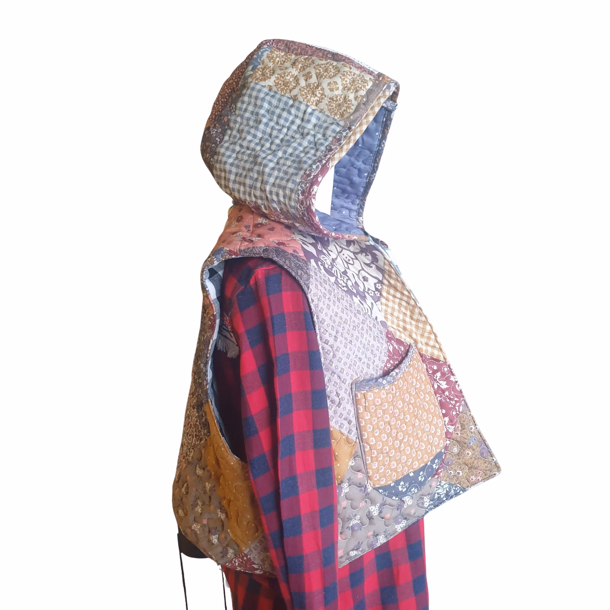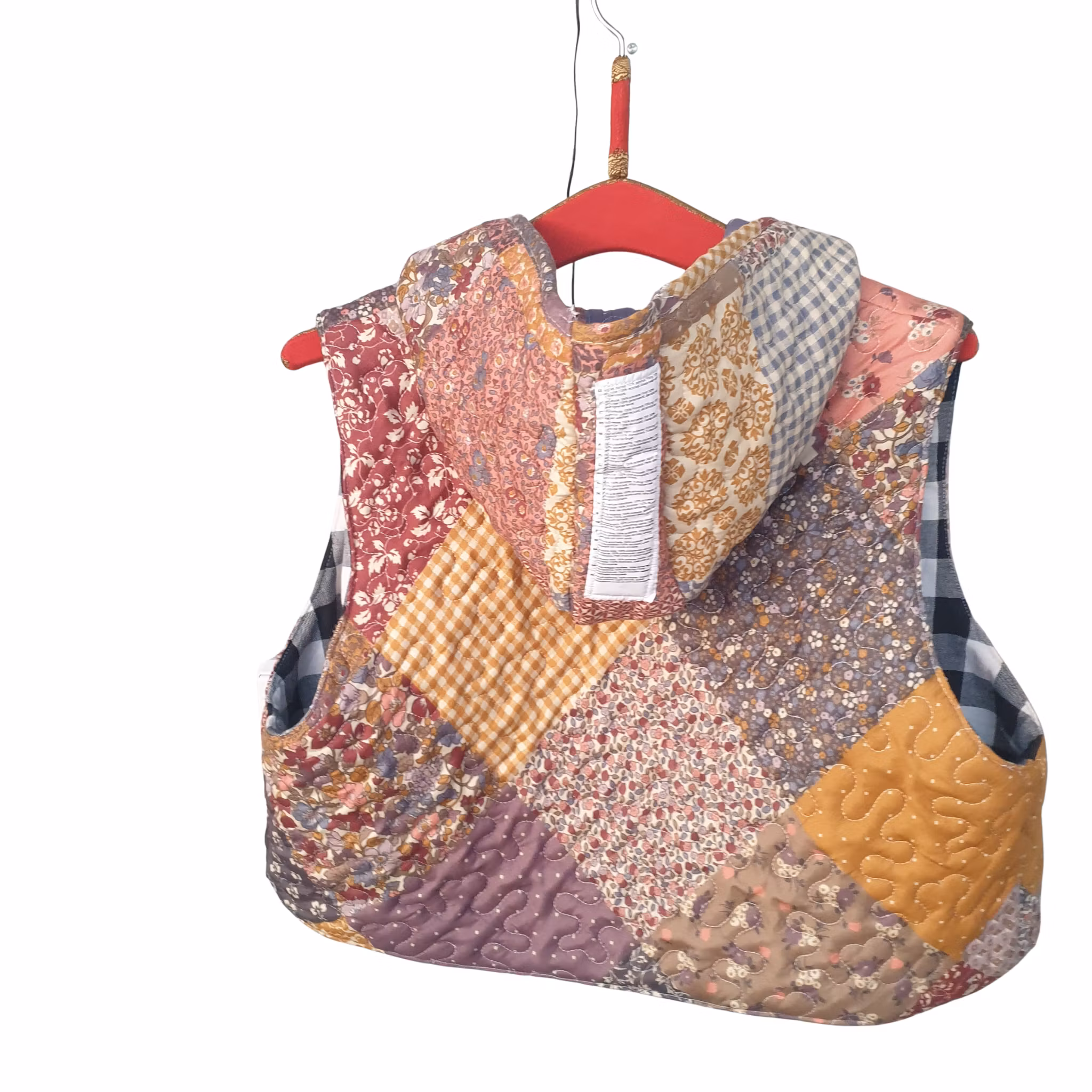 Material: En lite "boxig" rymlig vadderad väst. Quiltat pläd och foder i rutigt kraftigare tyg. Vintage tygmärke med Kiruna Kyrka.