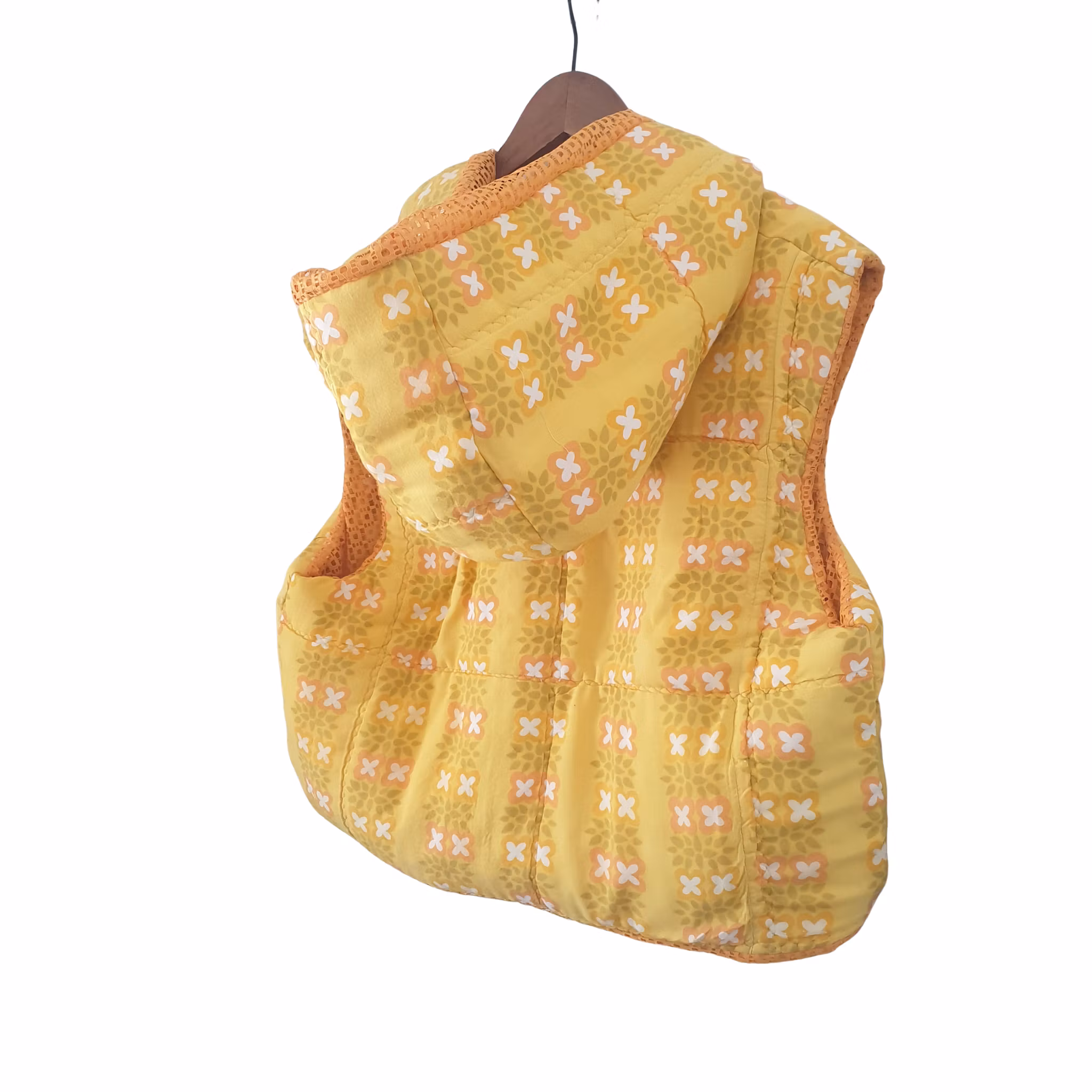 Material: Ett fint vadderat retro täcke i oranga toner med blommor och foder av skir orange gardin, lite transparent. Knytband med toffs framtill.