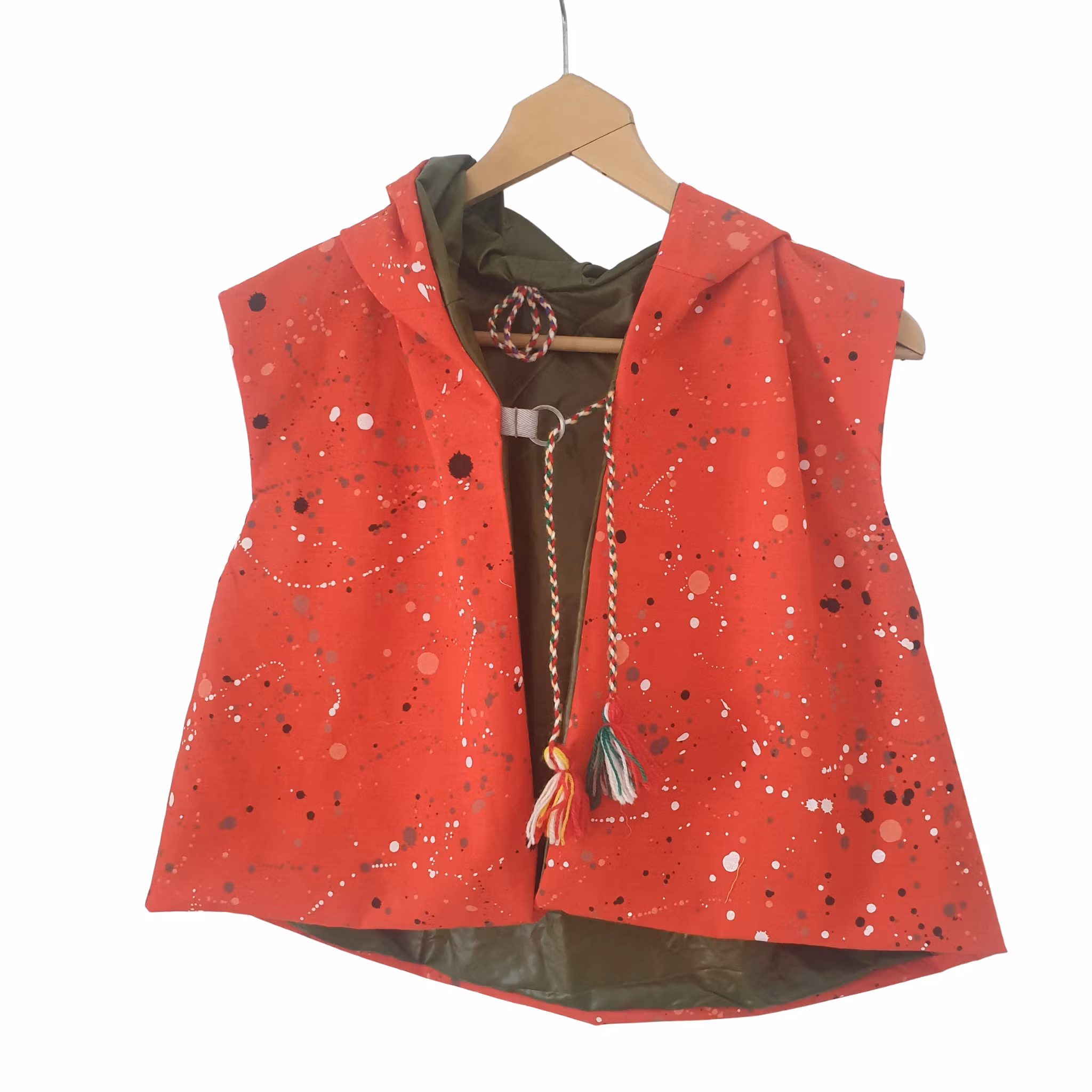 Material: En lite "boxig" rymlig vadderad väst. Spräcklig knallrött tyg i kombination med tältduk och detaljer från tältet. Färgglada handtvinnade toffsar.Vändbar.