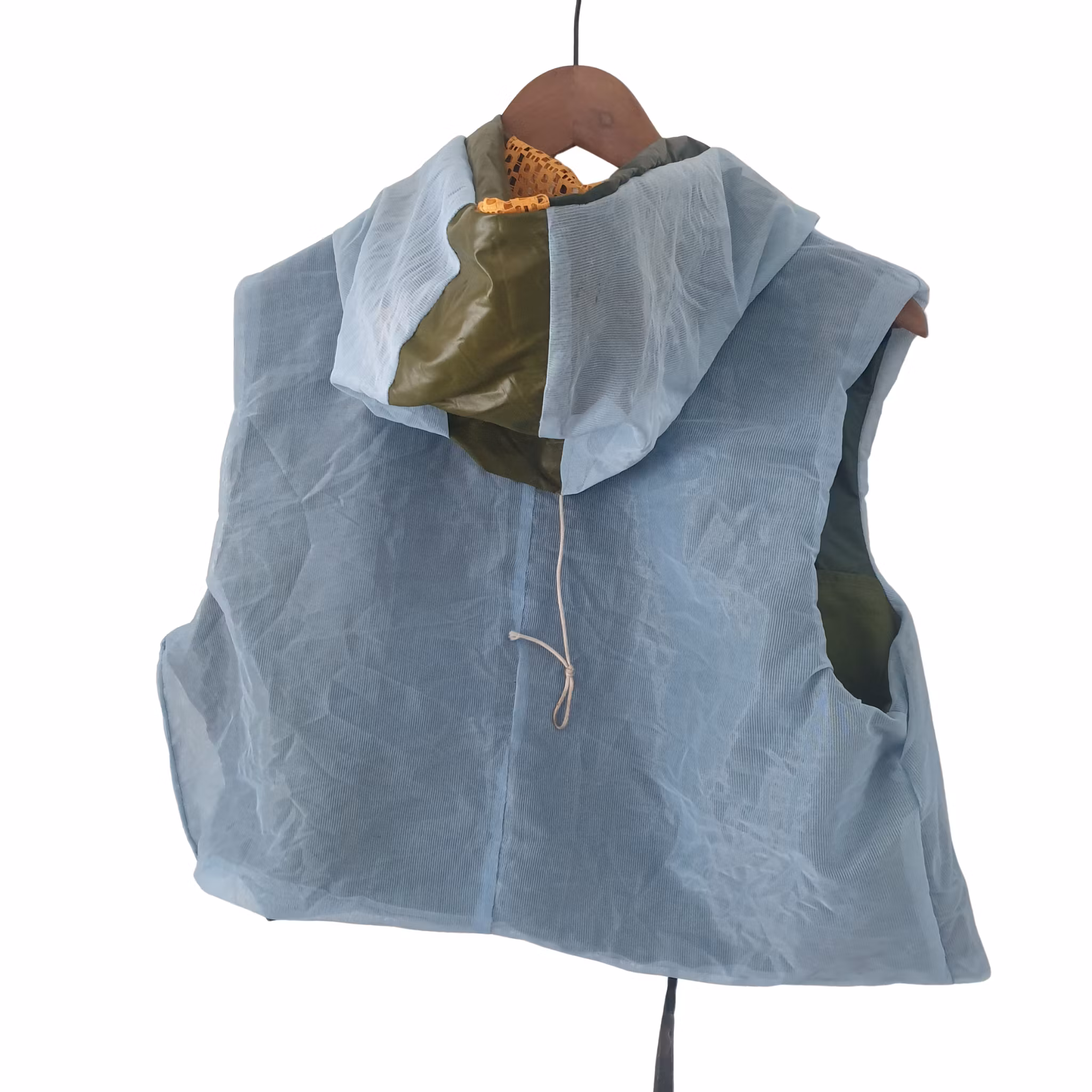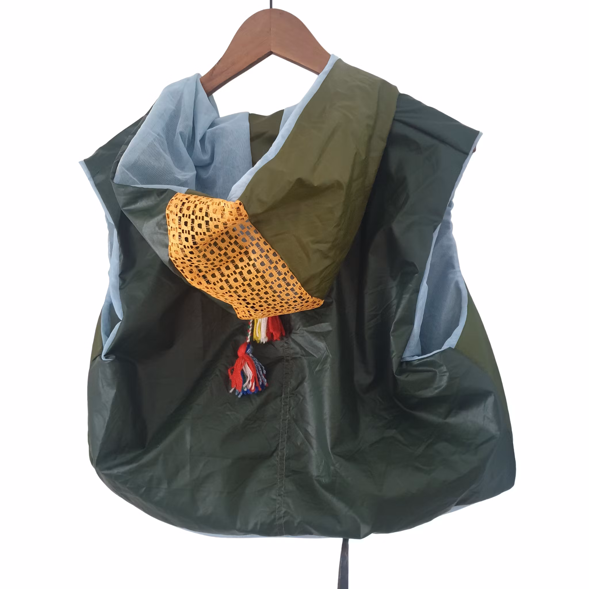 Material: En lite "boxig" rymlig vadderad väst. Återbruk av ett Fjällräventält med grön tältduk i kombination med ljusblått myggnät. Detaljer från tältlinor, nött Fjällrävenmärke samt handtvinnade garntoffsar. Ultralätt och tunn. Vändbar.